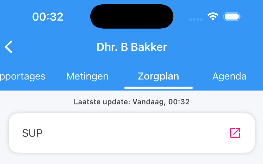 Zodra een snelkoppeling naar SUP is toegevoegd, wordt deze bovenaan het zorgplan weergegeven in de Ons® Dossier-app. De snelkoppling opent SUP via een browser of geïnstalleerde SUP-webapplicatie. Bekijk de handleiding Snelkoppeling in Ons Dossier voor meer informatie over het weergeven van de SUP-link.
