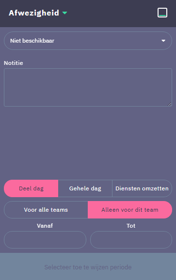 Optioneel is aan te geven of een afwezigheid geldig en zichtbaar is voor alle teams, of het team waarin op dit moment geroosterd wordt (Alleen voor dit team)