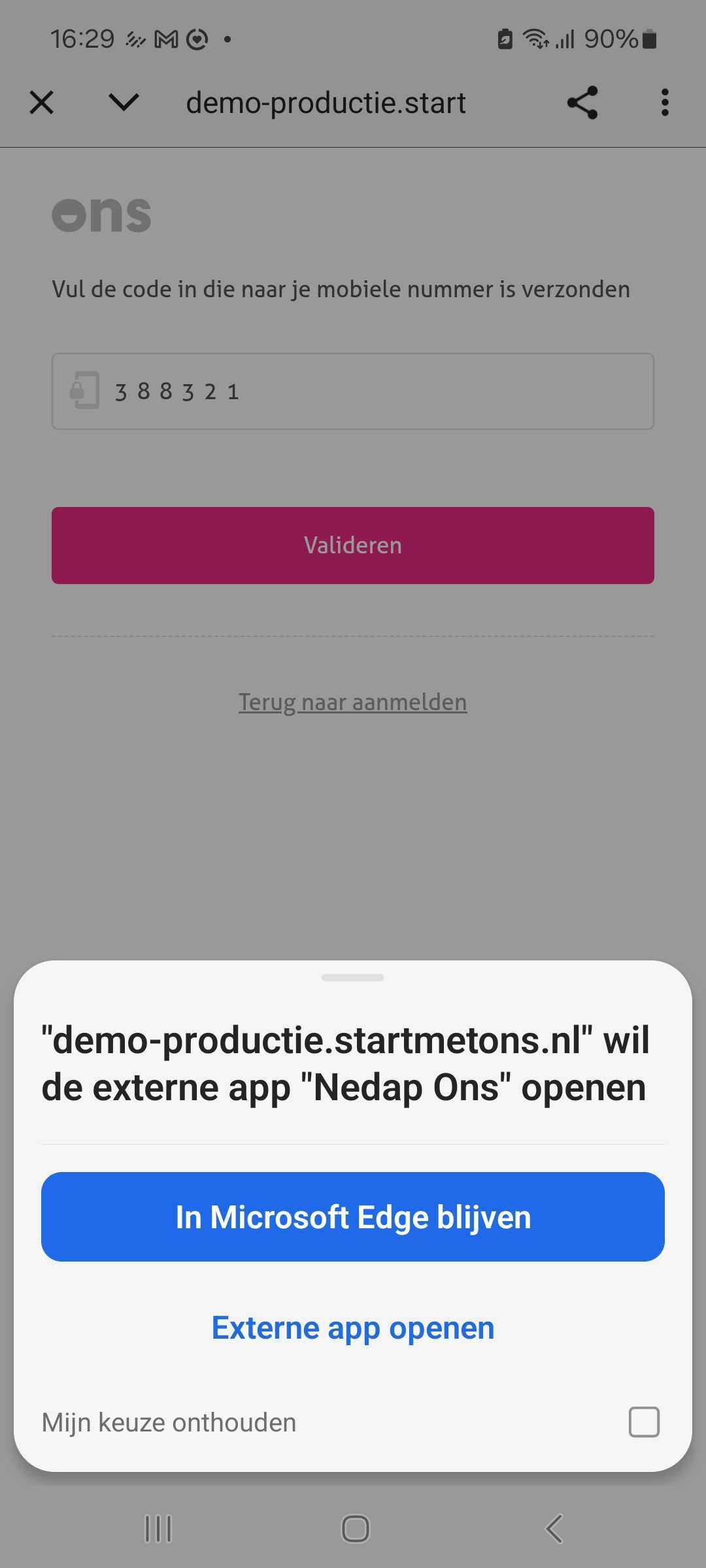 - Als jouw device Edge als standaard browser ingesteld heeft, kan het volgende venster geopend worden onderaan het scherm. Daarin krijg je de vraag of je in de browser wilt blijven of dat je een externe app wilt openen. Het is in deze stap belangrijk dat je op de optie Externe app openen klikt. Als je dit namelijk niet doet, zal je vervolgens een "404 not found" te zien krijgen. Mocht je per ongeluk op ''In Microsoft Edge blijven'' geklikt te hebben, dan kan je deze melding opnieuw triggeren door de browser data van Edge te wissen.