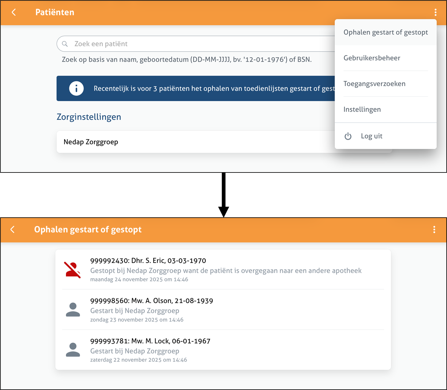 Wanneer je op de drie puntjes rechtsboven klikt, kun je via Ophalen gestart of gestopt inzicht in deze patiënten patiënten zijn gestopt.
