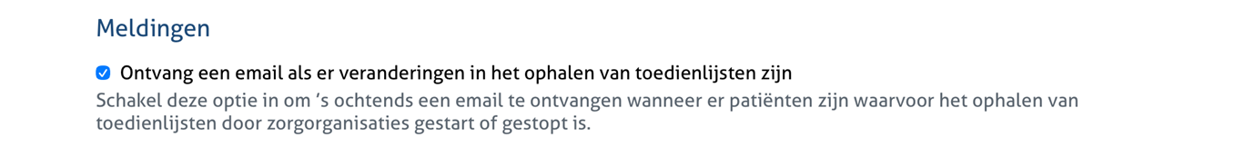 Je kan in de instellingen van Ons® Medicatie voor Apotheken Meldingen aanzetten voor het ontvangen van een geautomatiseerde e-mail. Deze e-mail ontvang je elke ochtend om 07.00 uur met daarin informatie over de wijzigingen in het ophalen van toedienlijsten die de vorige dag zijn gestart of gestopt. Je hebt de beheerdersrol nodig om deze Meldingen aan te kunnen zetten.