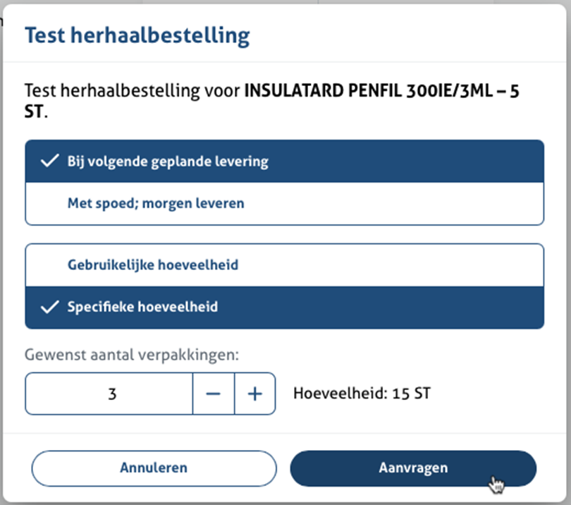 De pop-up komt overeen met de pop-up die zorgmedewerkers te zien krijgen wanneer zij een herhaalbestelling aanvragen. Bij de aanvraag kiezen zij zelf de levertijd: Bij volgende geplande levering of Met spoed; morgen leveren. Zorgmedewerkers kunnen ook de hoeveelheid meegegeven. Deze keuzes komen mee in het EDIFACT-bericht in de receptenbuffer.