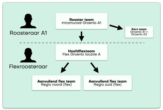 - Hoofdflexteam: Een team dat als flexteam geselecteerd is door een roosterteam. Dit team kan meerdere aanvullende flexteams hebben. Meerdere roosterteams kunnen hetzelfde team als hoofdflexteam selecteren. Het beheer van de flexaanvragen ligt hier met name bij de flexroosteraar.