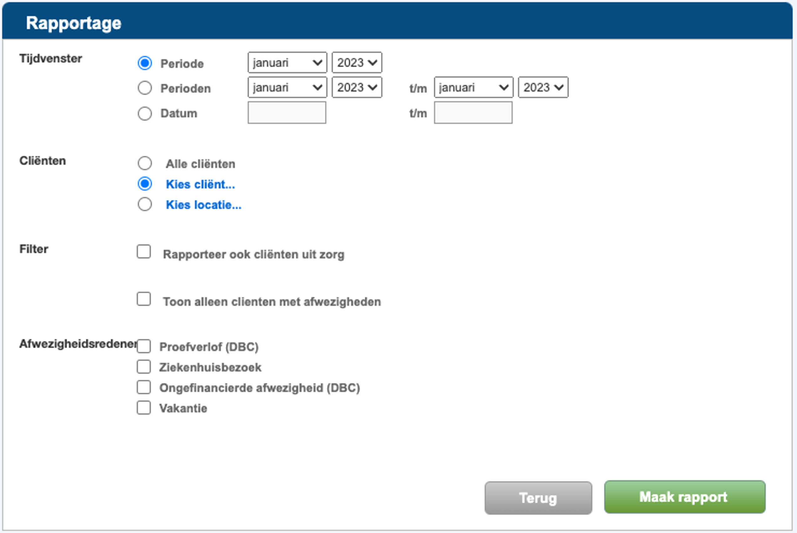 Selecteer het tijdsbestek, één of meer cliënten en eventueel de afwezigheidsredenen.