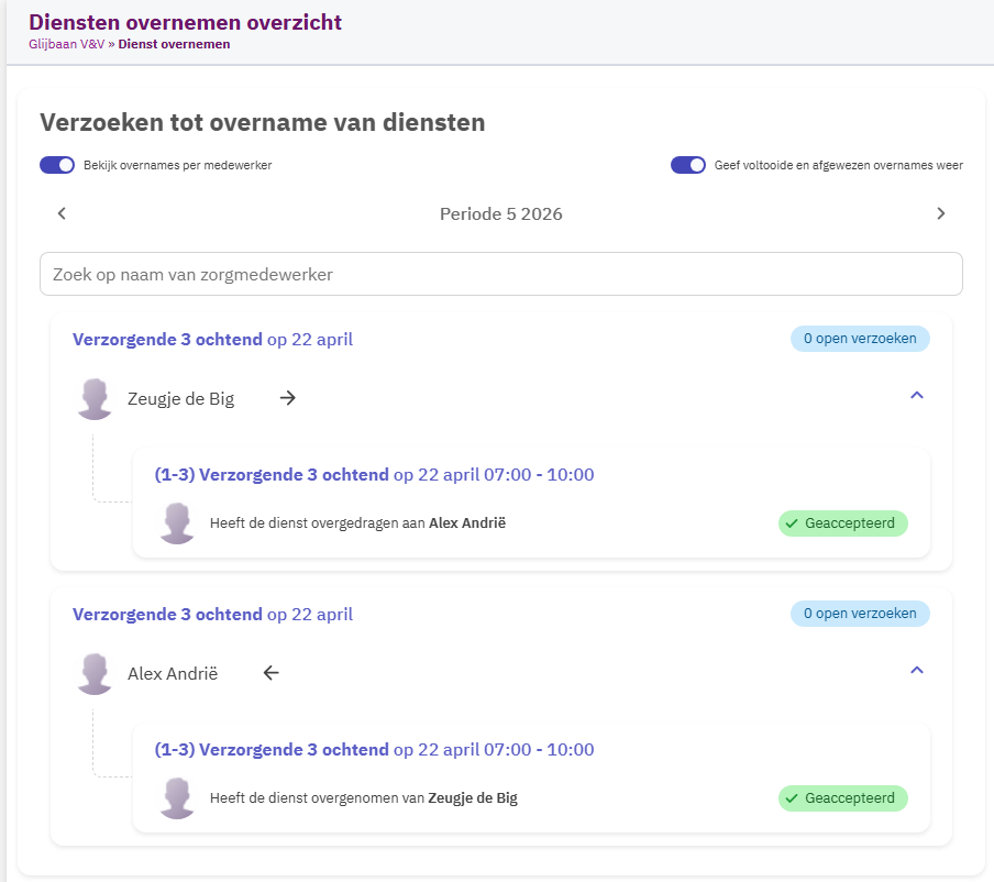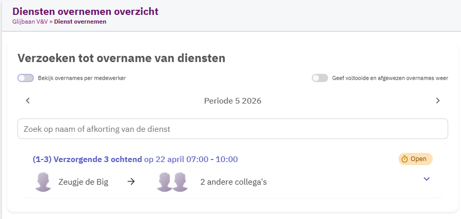 In het overzicht zie je alle dienstovername-verzoeken die gemaakt zijn door medewerkers van het geselecteerde team per maand. Als er voor een dienst een overnameverzoek is aangemaakt, dan zie je dat terug in dit overzicht. Per dienst zie je de verzoeken en de status van het verzoek. Standaard worden alleen de openstaande verzoeken weergegeven. Wil je ook de voltooide en afgewezen verzoeken tonen, dan kun je rechts bovenin op Geef voltooide en afgewezen overnames weer klikken.