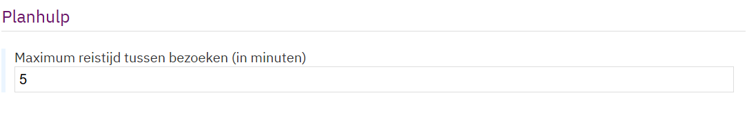 Het is mogelijk om op teamniveau de instelling op te voeren dat er een maximaal toegestane reistijd in minuten is. Dit houdt in dat de planhulp geen voorstellen maakt waarbij reistijd tussen cliënten in minuten hoger is dan de ingestelde maximum hoeveelheid. De instelling kan worden opgevoerd in de teaminstellingen van een team waarvoor de planhulp is ingeschakeld.