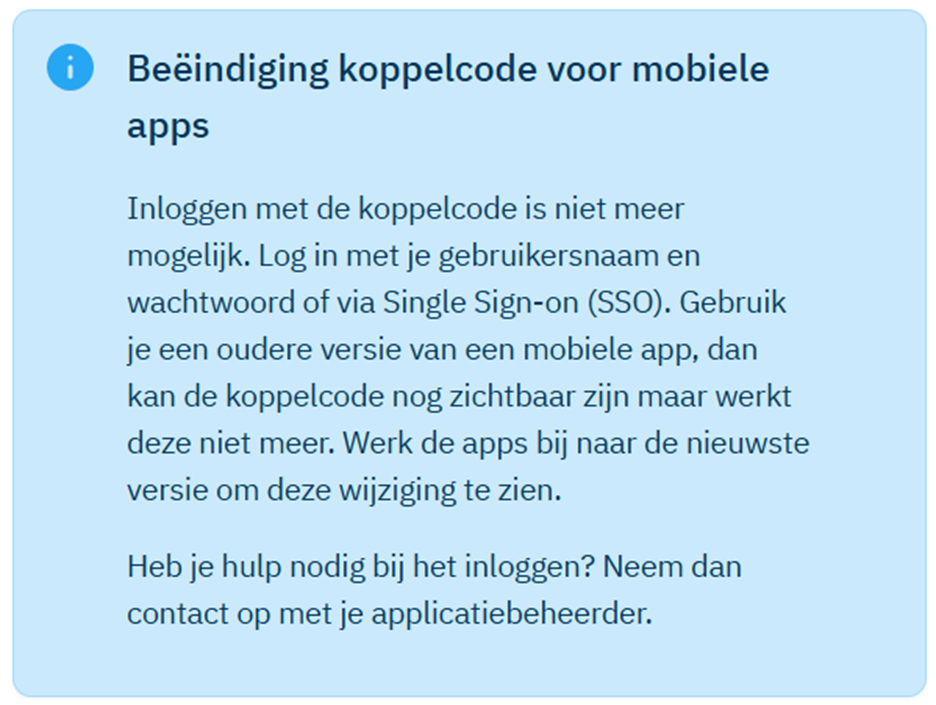 De beëindiging van de koppelcode als inlogmethode was uitgesteld. De beëindiging vindt nu plaats op 20 januari 2026. Vanaf dat moment is inloggen met een koppelcode niet meer mogelijk in de mobiele apps en op het webportaal.
