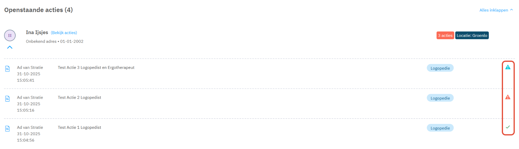 Is een actie alleen uitgezet voor jouw deskundigheid dan is de actie afgerond en wordt er een groen vinkje zichtbaar. De actie verdwijnt automatisch uit het overzicht. Als de actie is uitgezet voor meerdere deskundigheden dan wordt er een blauw driehoekje weergegeven tot de andere deskundigheid de actie ook heeft afgerond.