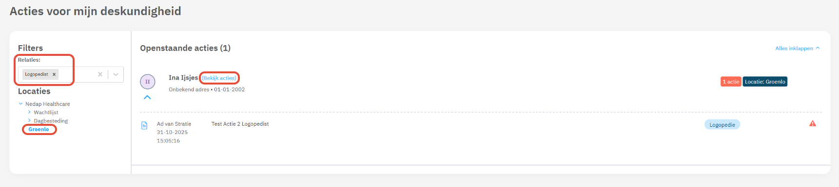 Op deze pagina heb je inzicht in de acties die voor jouw deskundigheid zijn uitgezet voor de cliënten waar je volgens je bereik bij mag. Het rode driehoekje met uitroepteken geeft aan dat er een actie openstaat voor jouw deskundigheid. Je kunt de actie voor jouw deskundigheid afronden door te klikken op de rode driehoek.