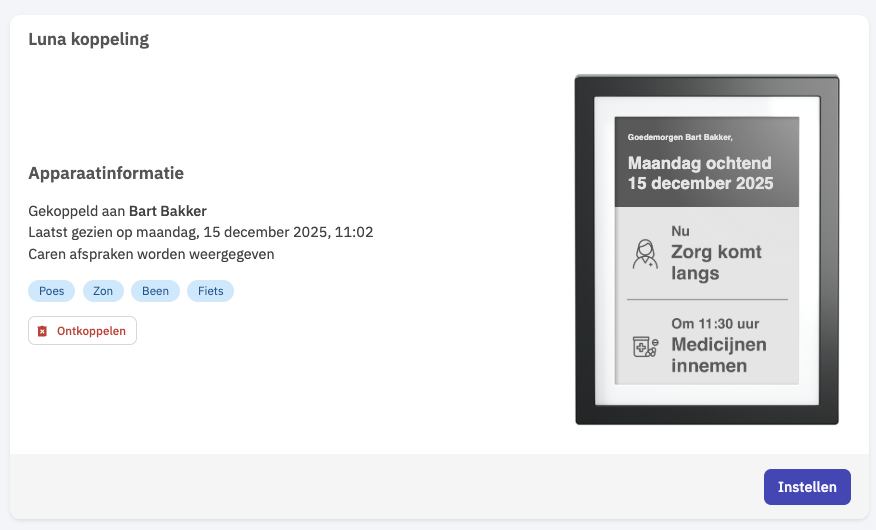 Deze informatie wordt alleen weergegeven als Nedap Luna is gekoppeld. In de handleiding Nedap Luna inzetten bij een cliënt lees je hoe je een Nedap Luna koppelt.