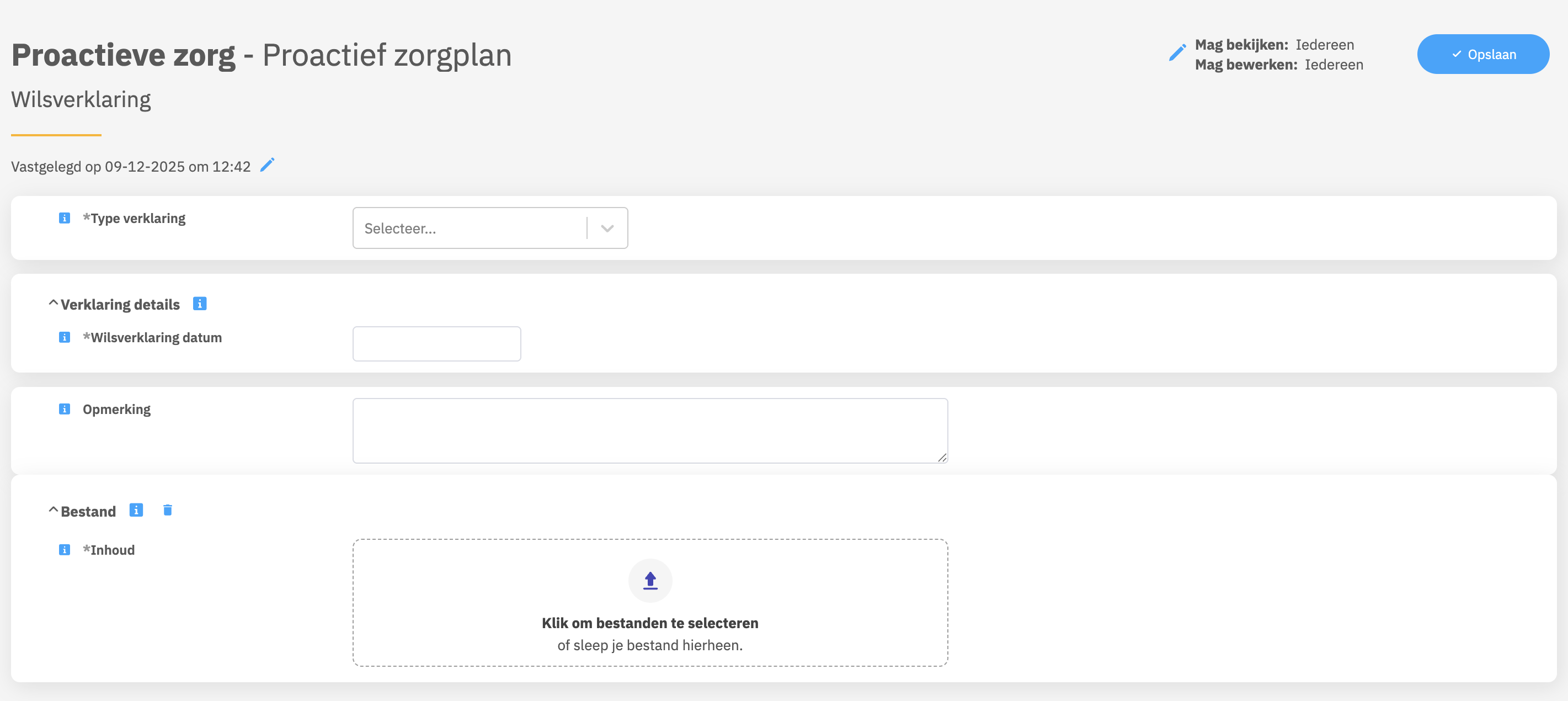 De ZIB Wilsverklaring wordt gevuld met informatie vanuit het dossier, waarbij de wilsverklaringen worden opgeslagen onder Proactieve zorg. De informatie wordt voor zowel Ons® → ZIB als voor ZIB → Ons® op dezelfde manier gemapt.